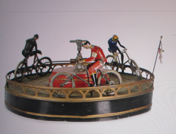Museum piece !! very rare antique mechanical bistro gambling toy with cyclists by Jules Lavennois, Paris 1890 !! 4 cyclists in metal and lead wheels are driven by chains as on a real bike and cyclists pedal. in a very good condition some paint lost box 40 cm x 40 cm cyclists ca 10 cm high/ length 15 cm 1150€ info : dirk.balduyck@telenet.be