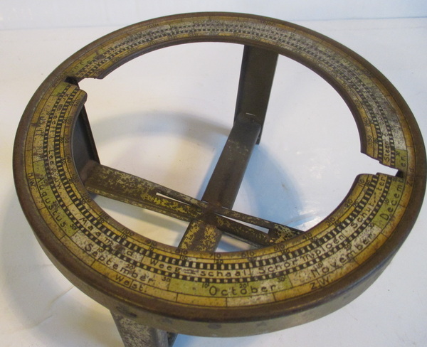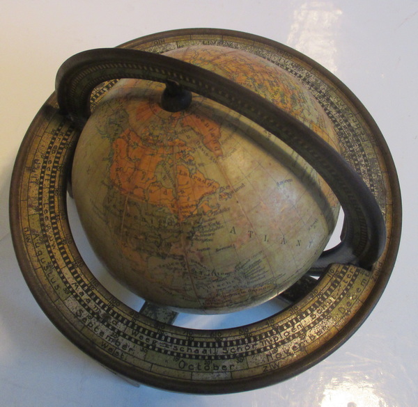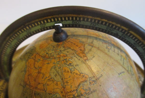 gorgeous small tin toy globe by van Balen, Wolters Groningen cardboard globe with paper labels tin base made by Wed. Bekkers & Sohn, Dordrecht ca 1925/30 acceptable condition some rust, small dent beneath the base height 9 - 15 cm/ globe 11 cm