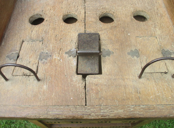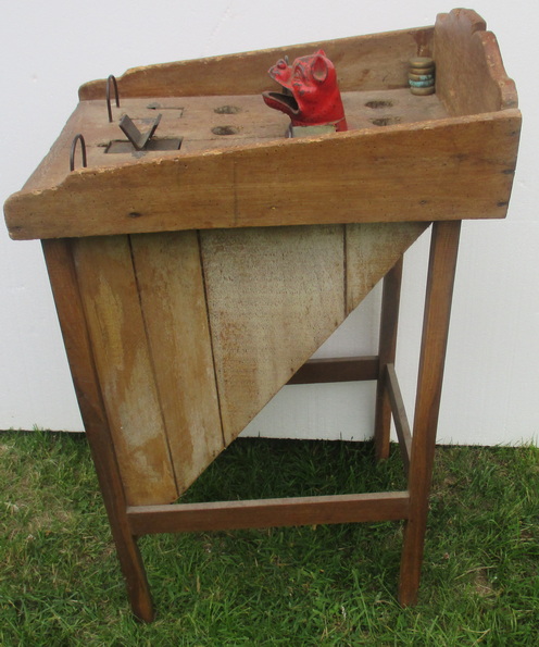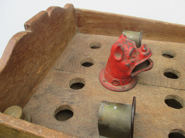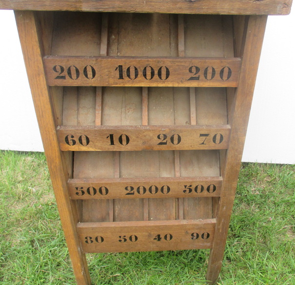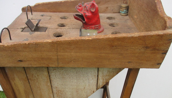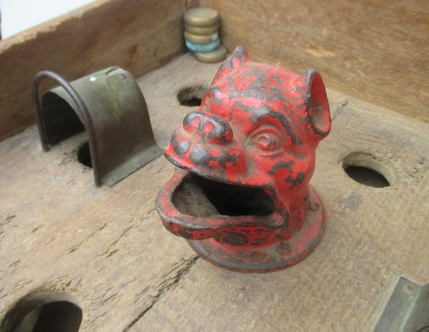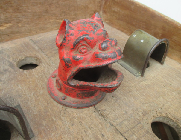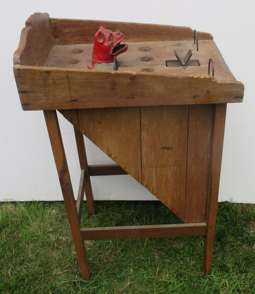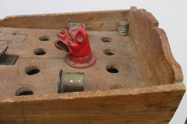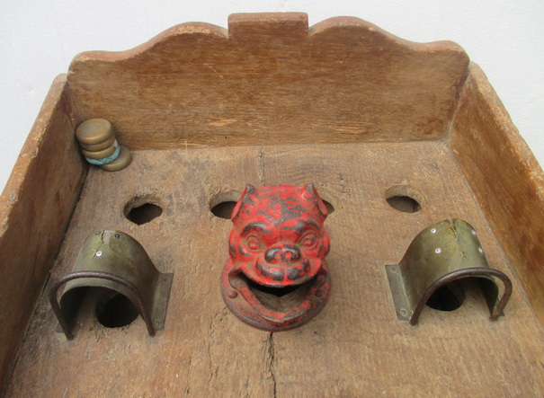 90 beautiful old French bistro game, fancy fair game " jeu de grenouilles " this version with the dog's head is very rare ! very rare and hard to find ! you have to try to throw brass-iron coins into the dogs mouth there are 5 coins ( diameter 3,5 cm ) with ! ca 1920 very good condition ! of course a lot traces of use and age ! beautiful patina ! 58 cm x 44 cm/ height 78 cm -87 cm