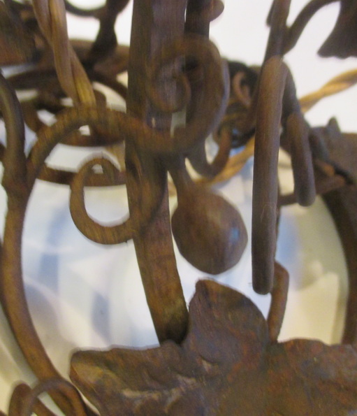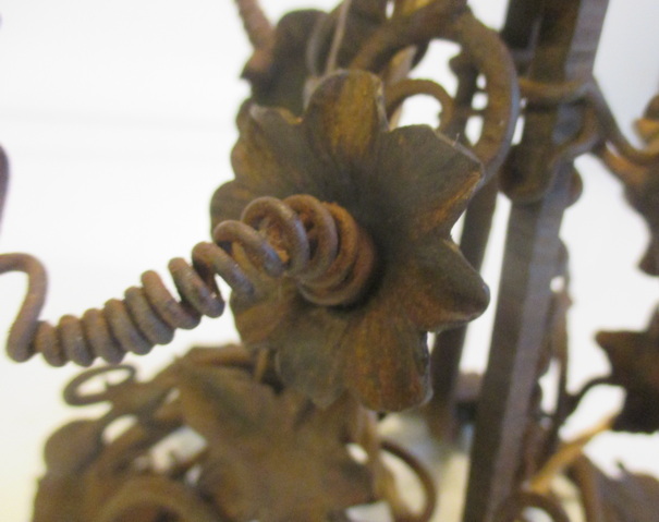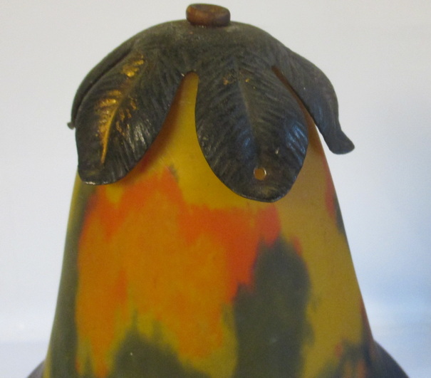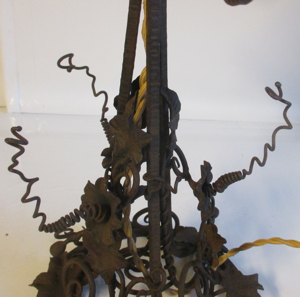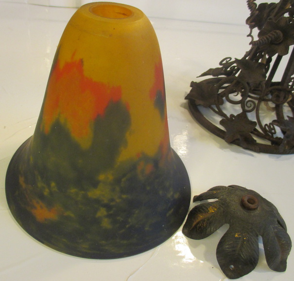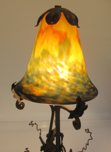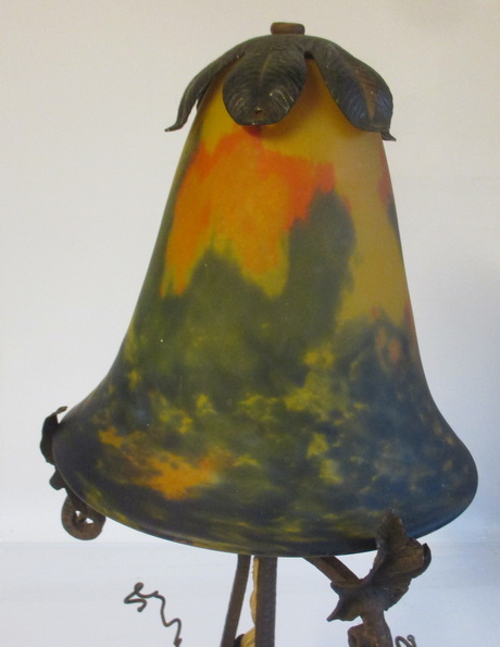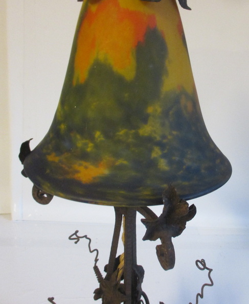 gorgeous French art deco table lamp pate de verre shade signed Noverdy, not signed beautiful wrought iron fixture with grapes and leaves ca 1930 height 45 cm / shade 16 cm ! very good condition, but rusty !! electricity renewed !! and this is a kind of " mariage "