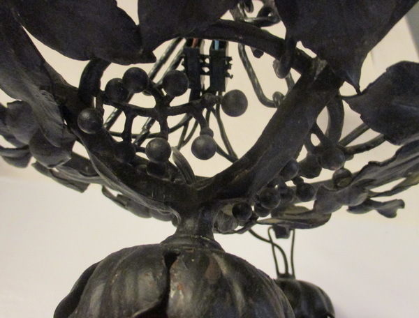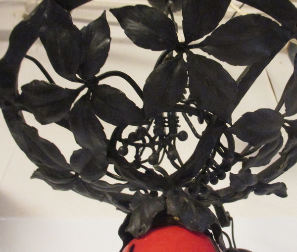 art deco wrought iron ceiling lamp with four glass shades by M. Powolny, for Loetz ca 1930 gorgeous decorated black painted fixture some small rusty spots new electricity french fitting system height 26 cm / diameter 30 - 40 cm