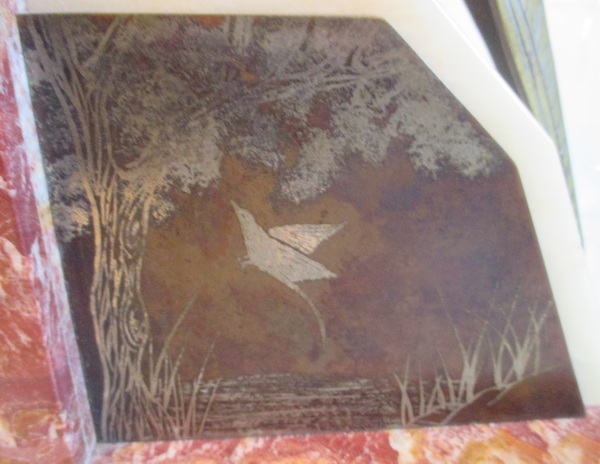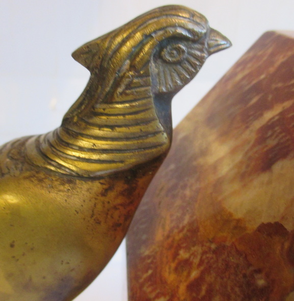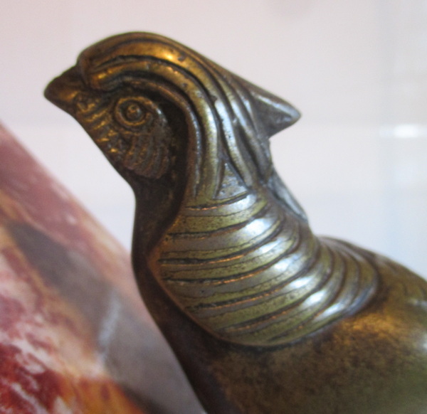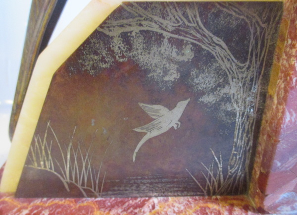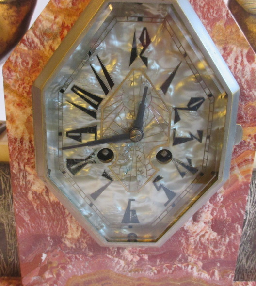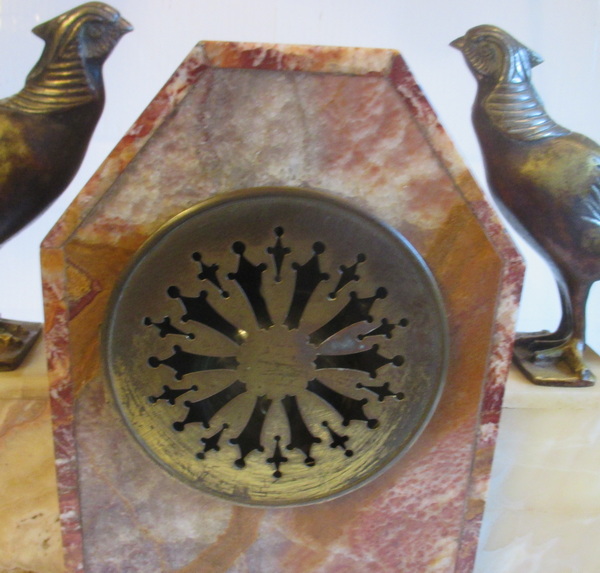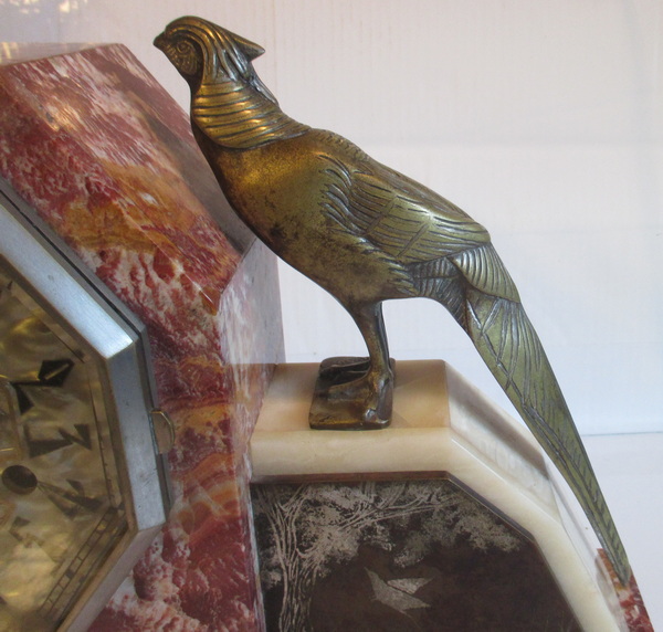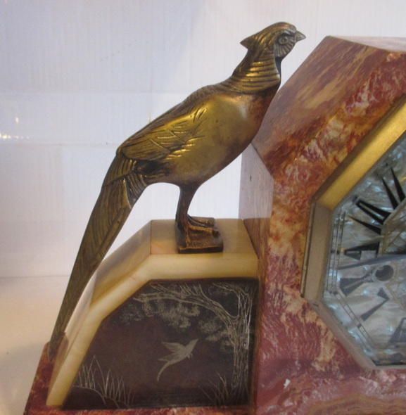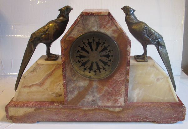 original art deco marble mantle clock with bronze faisants at both side signed by Irénée Rochard, France beautiful geometric mother of pearl dial and very geometric numbers ca 1930 exceptional good condition but clock isn't working marble 47 cm x 11 cm x 6 cm total height 30 cm faisants ca 14 cm -20 cm