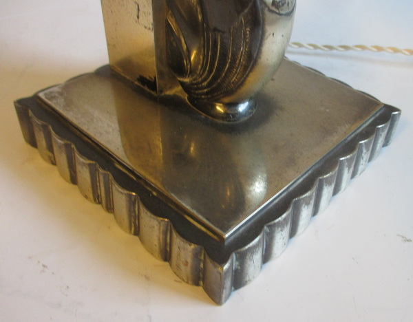 gorgeous art deco table or desk lamp chromed bronze fixture with bronze pigeon standing on the base with beautiful opaline shade very geometric and cubistic design in the style of Sandoz ca 1930/40 very good condition, electricity ok BUT needs a very good refreshment total height 32 cm/ base 14 cm x 14 cm the shade diameter 20 cm x 10 cm high 150€ info : dirk.balduyck@telenet.be