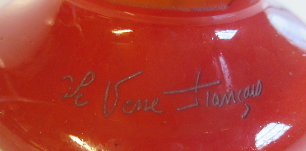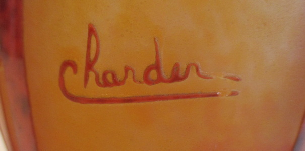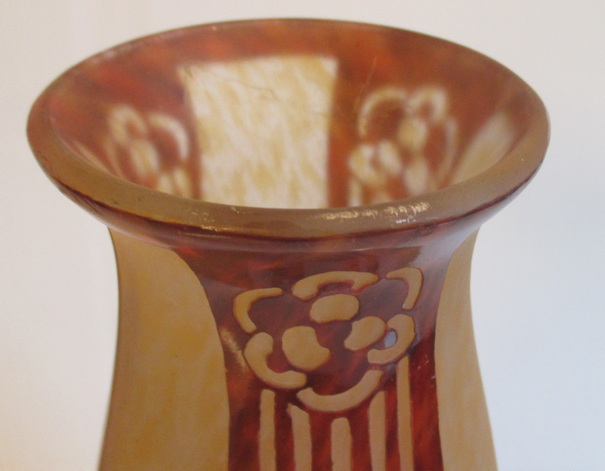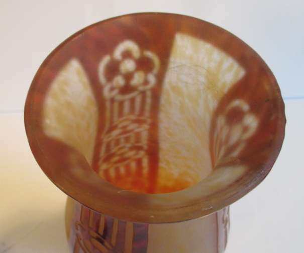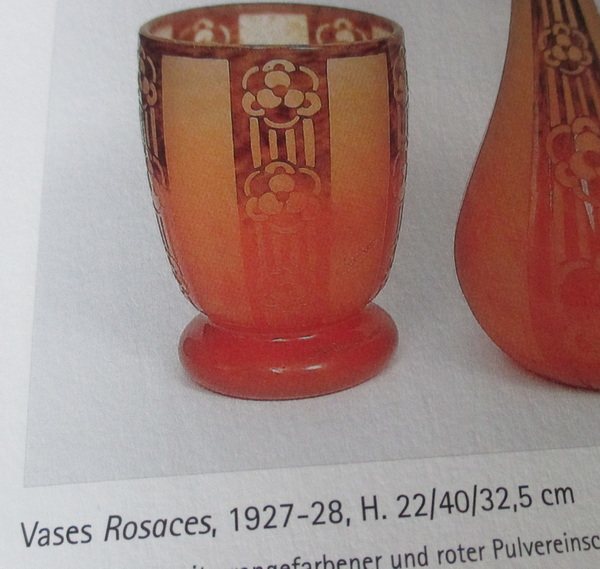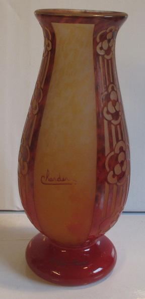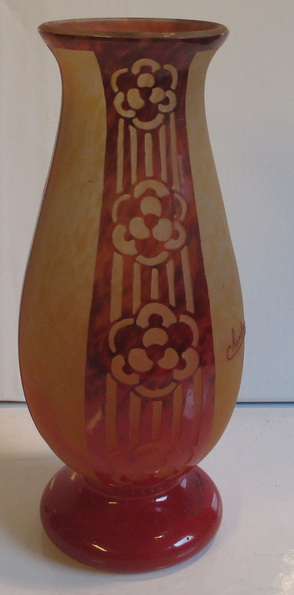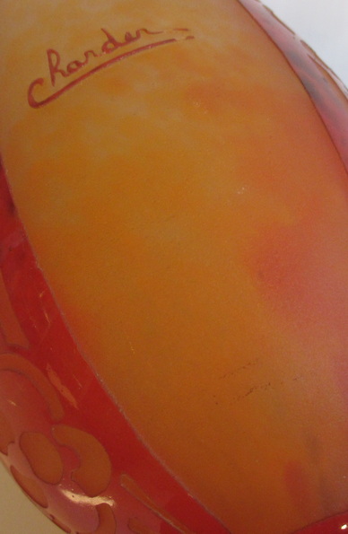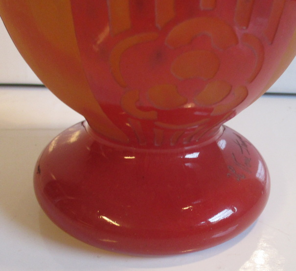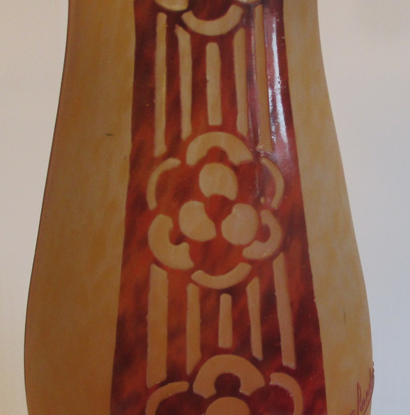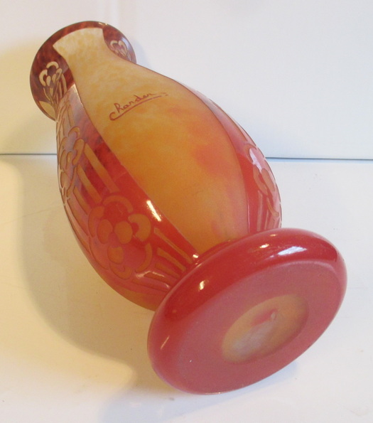 gorgeous original acid etched cameo vase by Charles Schneider signed Le Verre Francais & signed Charder decor Rosaces red glass overlaid with orange acid-etched pattern ca 1924-1927 extremely good condition one miniscul scratch, very diffult to see ! small production default / éclat on the Charder signature height 30 cm decor pictured in the catalogue Charles Schneider by MC Joulin/ G. Maier