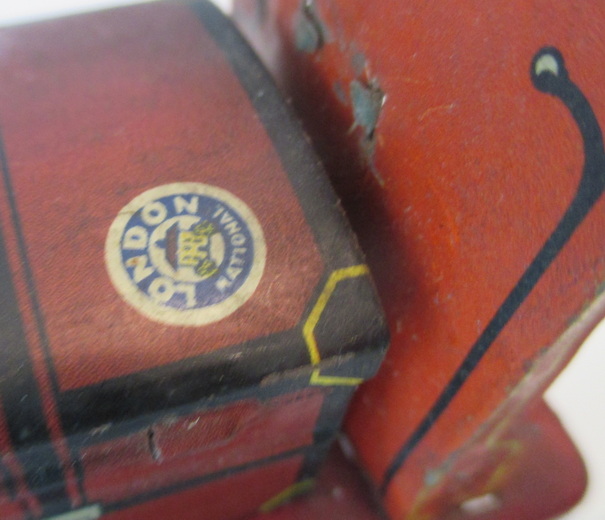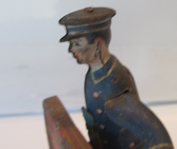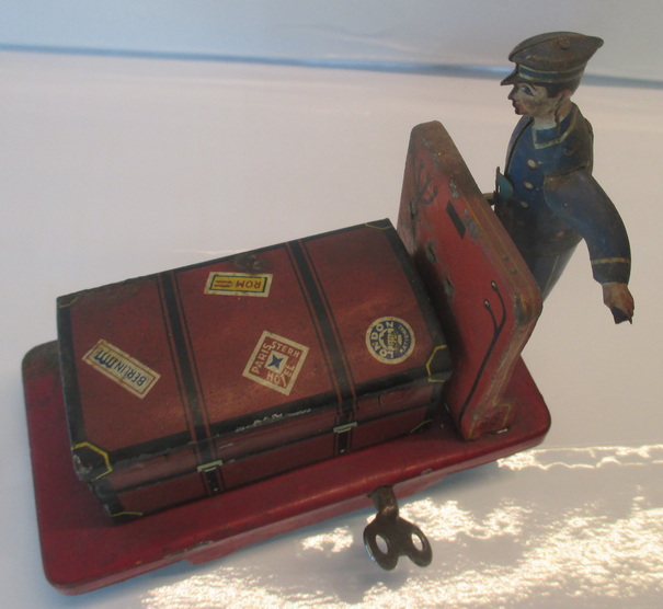 antique wind up tin toy luggage porter by Hammerer & Kuhlwein ca 1930, Germany needs a complete restoration : some rust / porter is missing a little signal one wheel not original wind up system is blocked but it's still a good rare item !